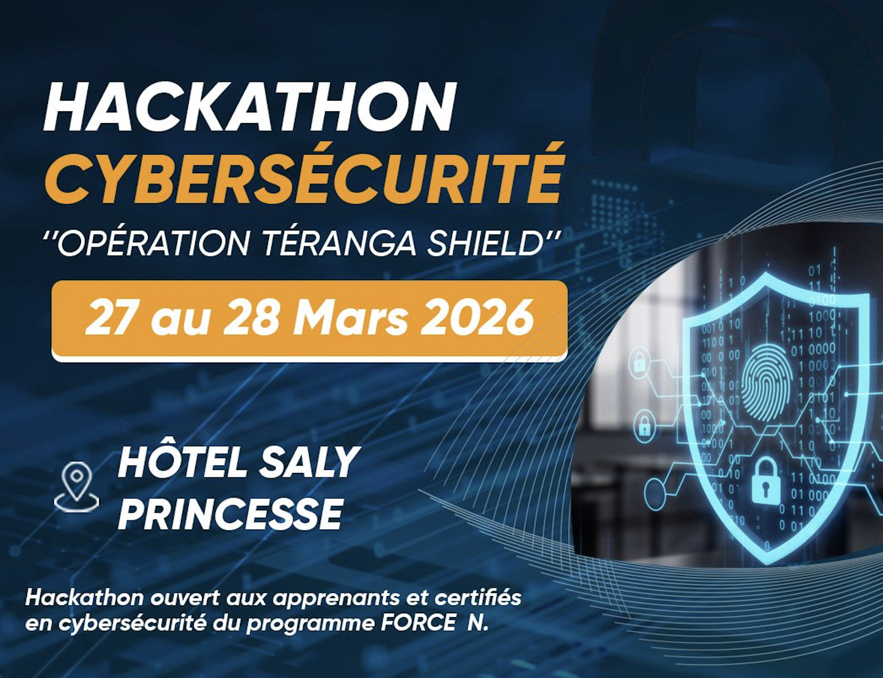 Dans une dynamique de renforcement de la souveraineté numérique du Sénégal, le programme Force-N Sénégal, mis en œuvre par l’ Université numérique Cheikh Hamidou KANE – Un-Chk (ex UVS) en partenariat avec la Mastercard Foundation lance le challenge de cybersécurité « 𝗢𝗽𝗲́𝗿𝗮𝘁𝗶𝗼𝗻 𝗧𝗲𝗿𝗮𝗻𝗴𝗮 𝗦𝗵𝗶𝗲𝗹𝗱 », les 27 et 28 mars 2026 à Saly.