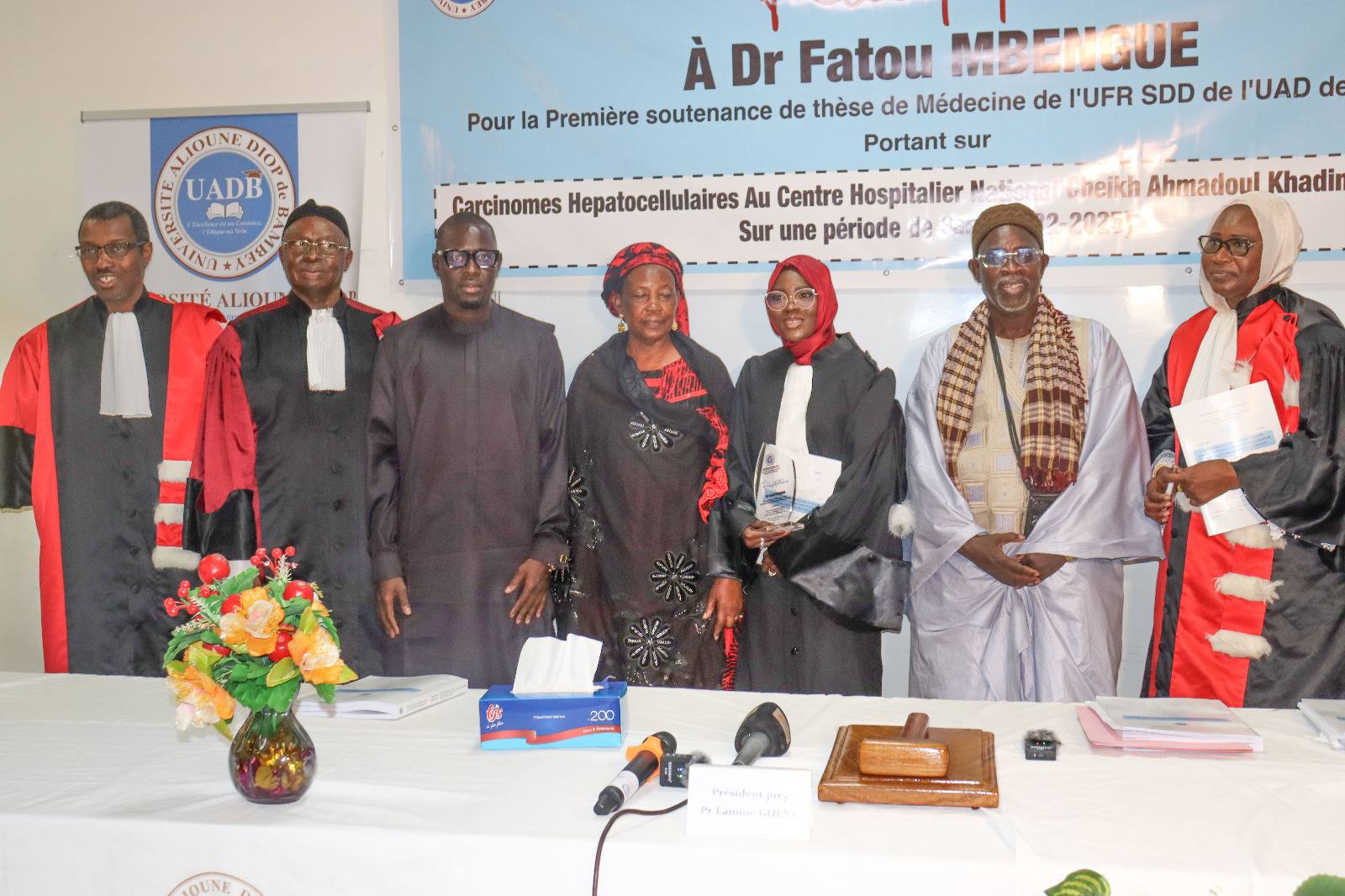 Émue et applaudie pour sa note de 18/20 par l’assistance, Dr Fatou Mbengue a reçu des compliments du Recteur Professeur Ibrahima Faye qui a assisté à cette journée mémorable et à la première d’une série de soutenance de cette promotion en Médecine.