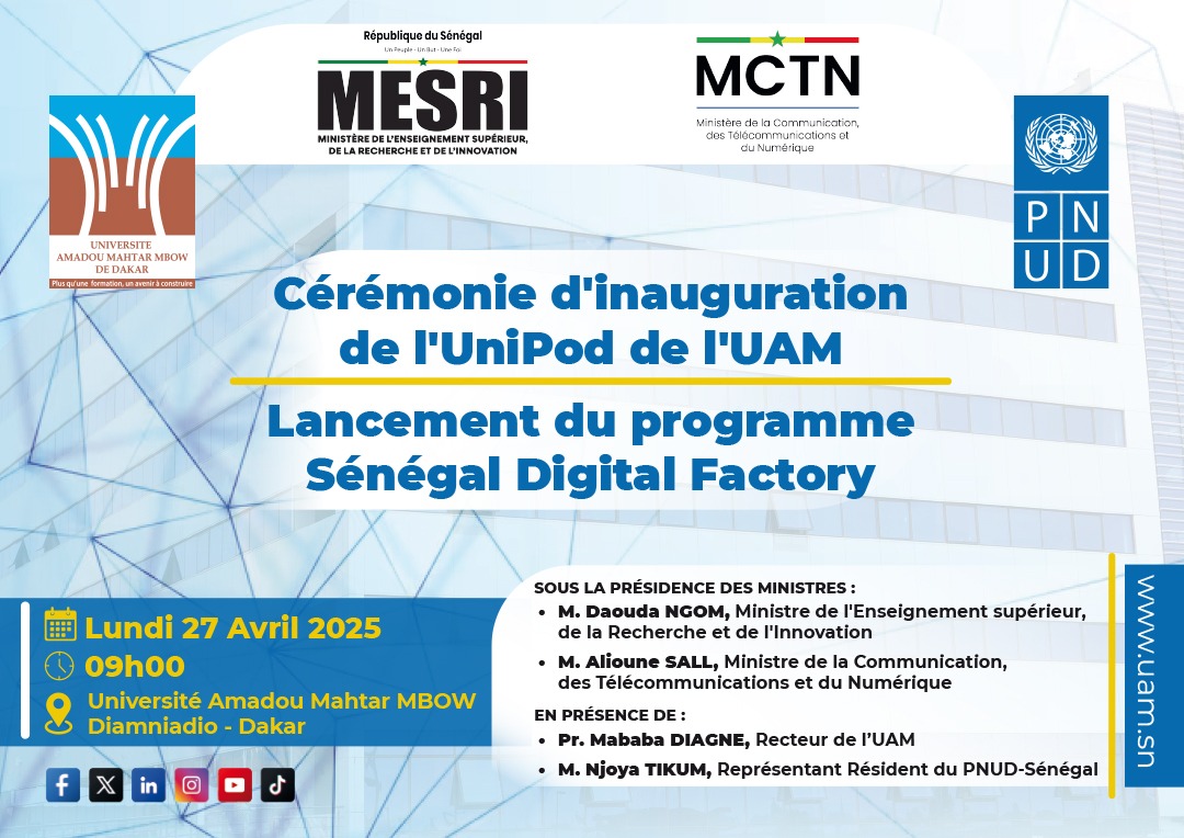 Le Recteur de l’Université Amadou Mahtar MBOW (UAM) a le plaisir d’annoncer la tenue de la cérémonie officielle d’inauguration de l’UniPod de l’UAM, couplée au lancement du programme Sénégal Digital Factory, le lundi 27 avril 2026 à partir de 09h00, sur le campus de Diamniadio.