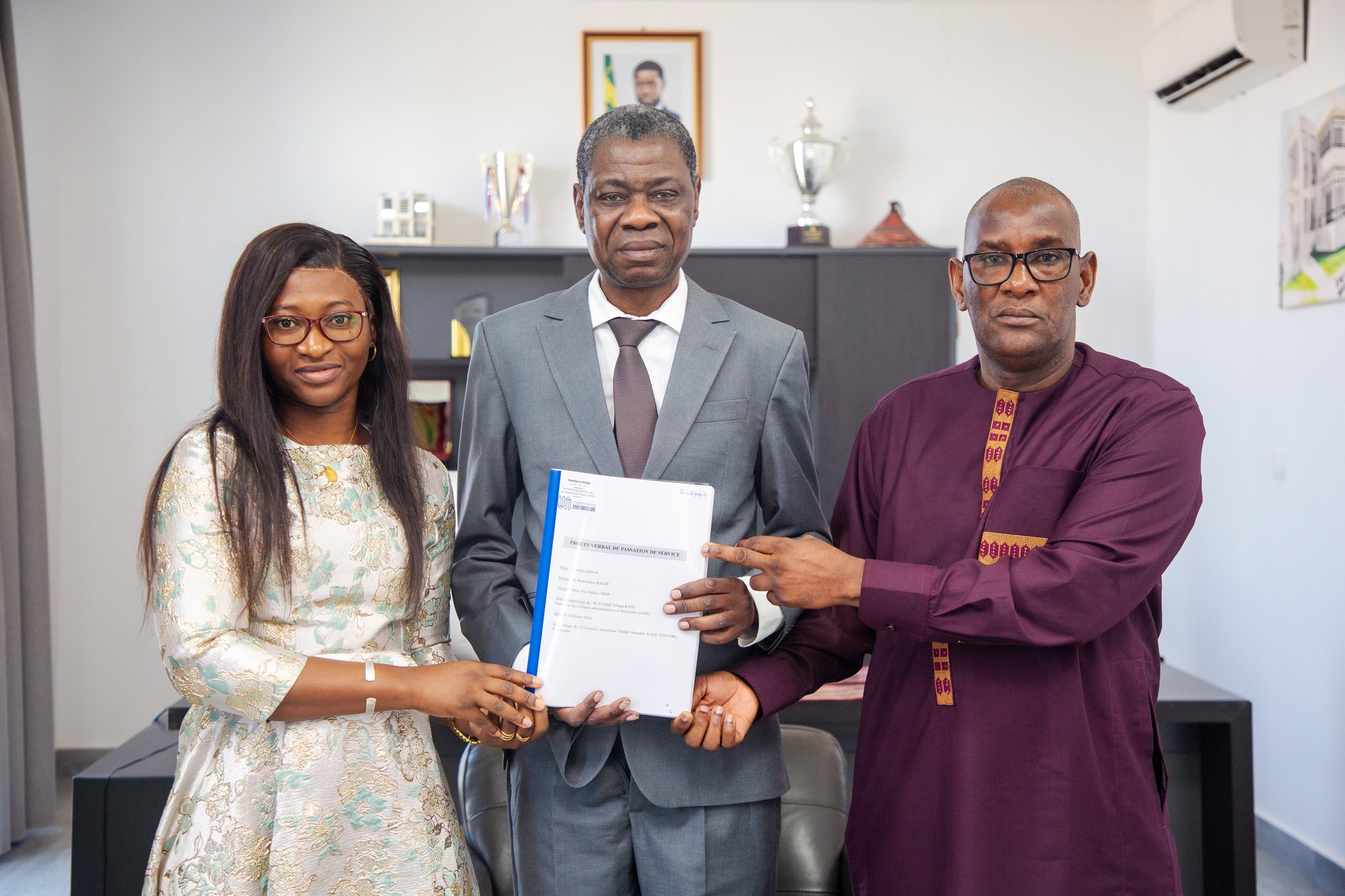 M. Hammadou BALDE, Secrétaire général sortant de l’UN-CHK a passé le témoin à Madame Awa NDIAYE DIOP, nouveau Secrétaire général au cours d’une cérémonie solennelle de passation de services tenue le mardi 24 février 2026 au siège de l’université, sis à Diamniado.