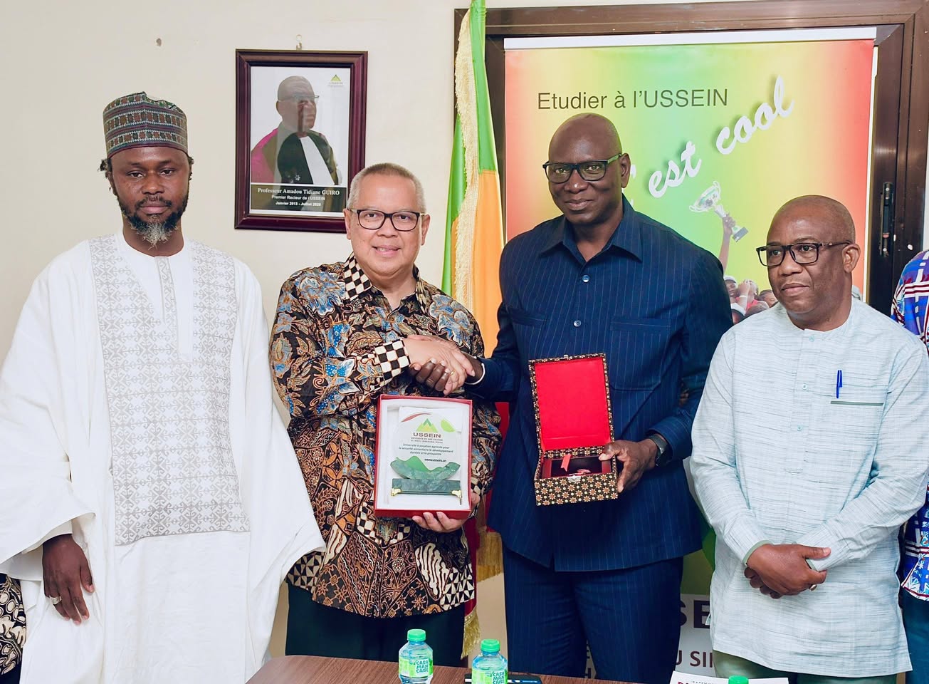 Le Recteur de l’USSEIN, le Professeur Diegane Diouf, accompagné de ses collaborateurs, a reçu la visite d’une délégation conduite par Son Excellence Ardian Wicaksono, Ambassadeur d’Indonésie au Sénégal. Cette rencontre s’inscrit dans une dynamique de renforcement des relations et de la coopération entre les deux nations.