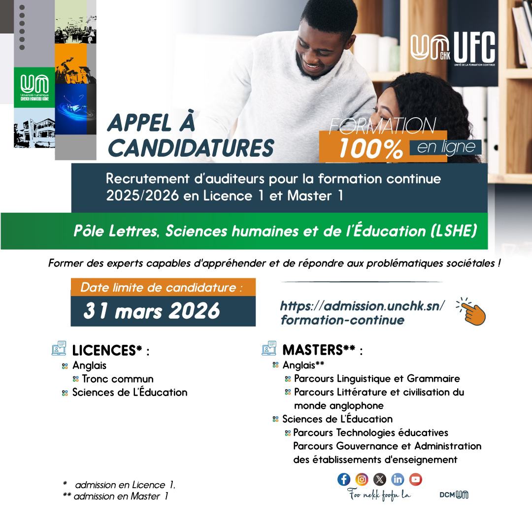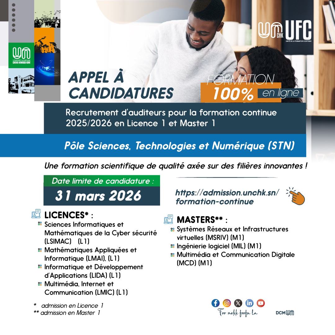 Le dépôt des dossiers de candidature s’effectue exclusivement en ligne, sur la plateforme https://admission.unchk.sn, rubrique formation continue (payante), jusqu’au mardi 31 mars 2026, à 23h59, délai de rigueur.
